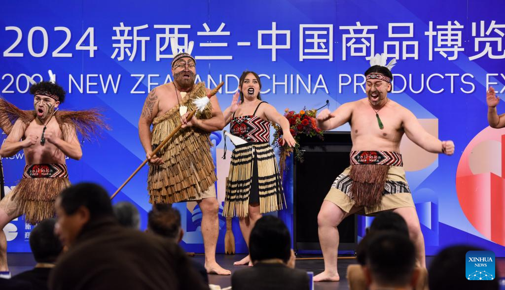 A performance of traditional Maori dance and singing is staged during the opening ceremony of the 2024 New Zealand-China Products Expo in Auckland, New Zealand, Sept. 20, 2024. (Xinhua/Guo Lei)