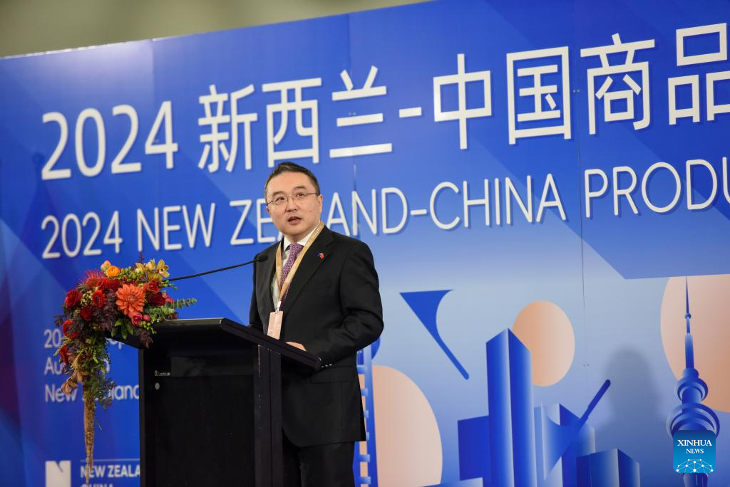 Chinese Ambassador to New Zealand Wang Xiaolong speaks during the opening ceremony of the 2024 New Zealand-China Products Expo in Auckland, New Zealand, Sept. 20, 2024. (Xinhua/Guo Lei)
