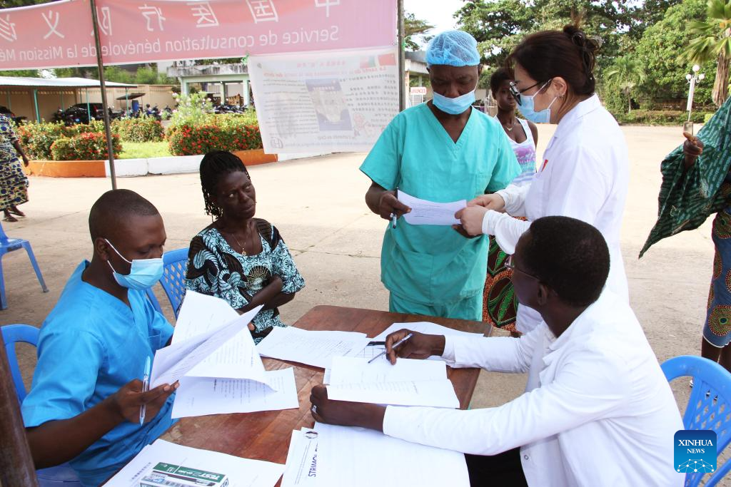 A doctor of the 27th batch of Chinese medical team communicates with a patient during a free dental clinic service event at a hospital in Lokossa, Benin, Sept. 20, 2024. (Photo by Seraphin Zounyekpe/Xinhua)
