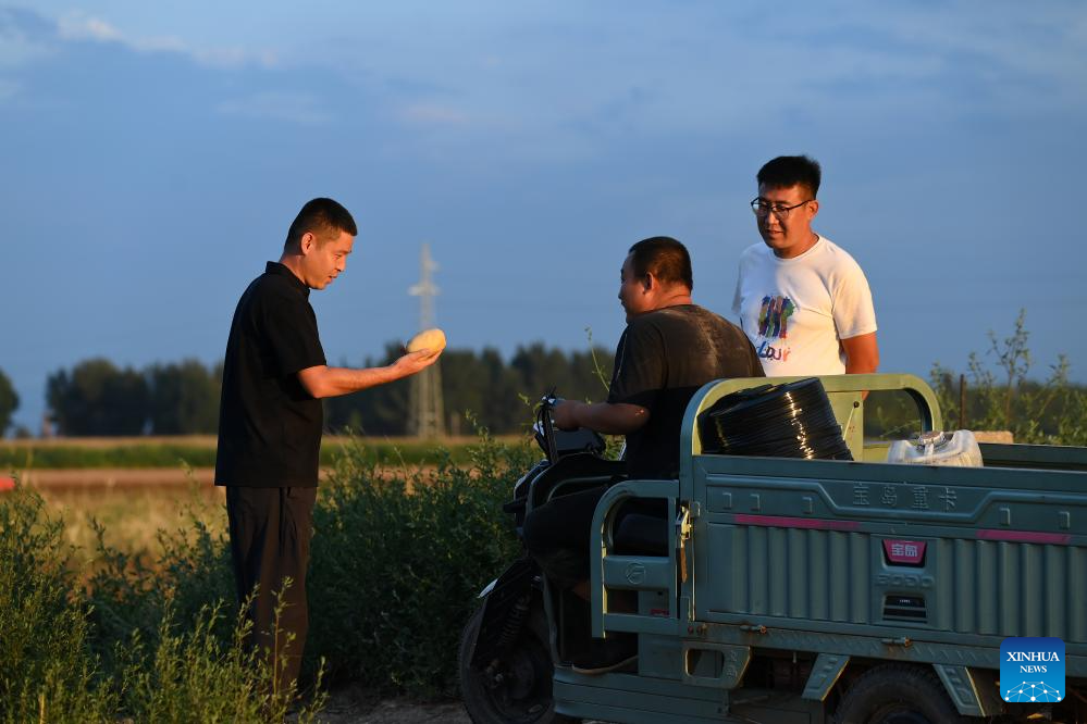 Zhao Yongzhuang (3rd R) asks villagers about their potato harvest in Nanwulao Village, Wenshui County of north China's Shanxi Province, Aug. 8, 2024. (Photo by Liu Liangliang/Xinhua)