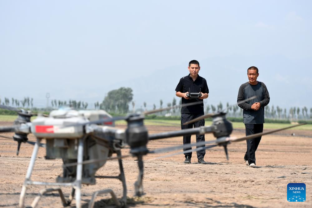 Zhao Yongzhuang (L) operates a drone to spray pesticide in a field in Beizhang Township, Wenshui County of north China's Shanxi Province, Aug. 20, 2024. (Xinhua/Zhan Yan)?