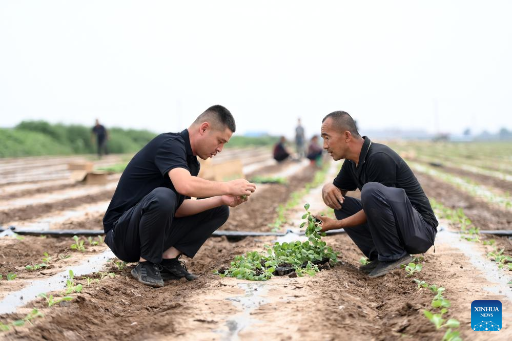 Zhao Yongzhuang (L) checks the growth of cabbage mustard seedlings in Beizhang Township, Wenshui County of north China's Shanxi Province, Aug. 8, 2024. (Photo by Liu Liangliang/Xinhua)