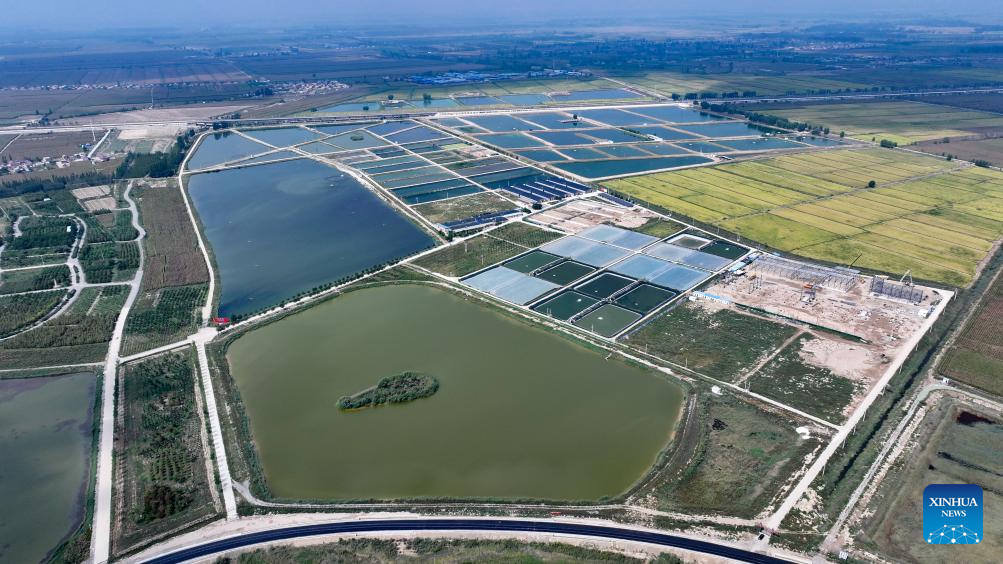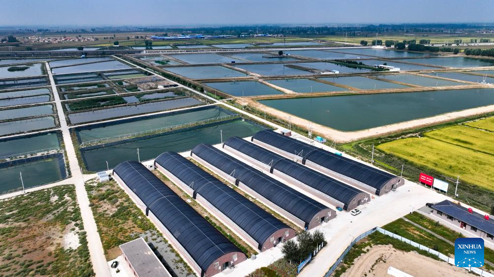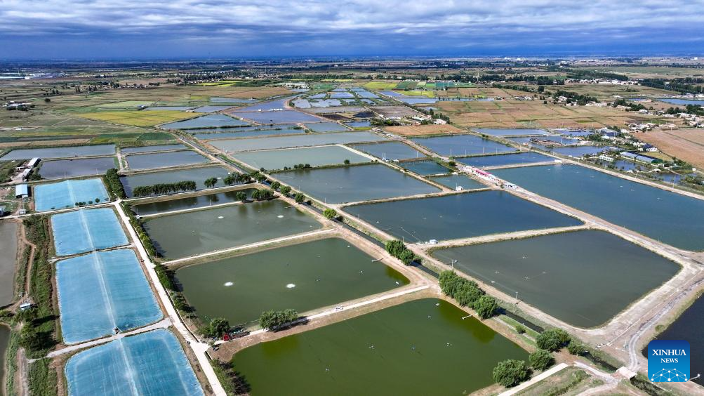 An aerial drone photo taken on Sept. 20, 2024 shows an aquaculture base in Helan County, Yinchuan, northwest China's Ningxia Hui Autonomous Region. With abundant water resources from the Yellow River, Yinchuan has vigorously developed fisheries in recent years. (Xinhua/Yang Zhisen)