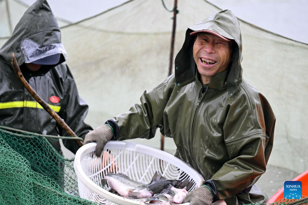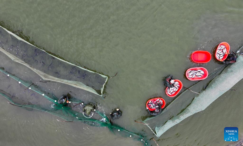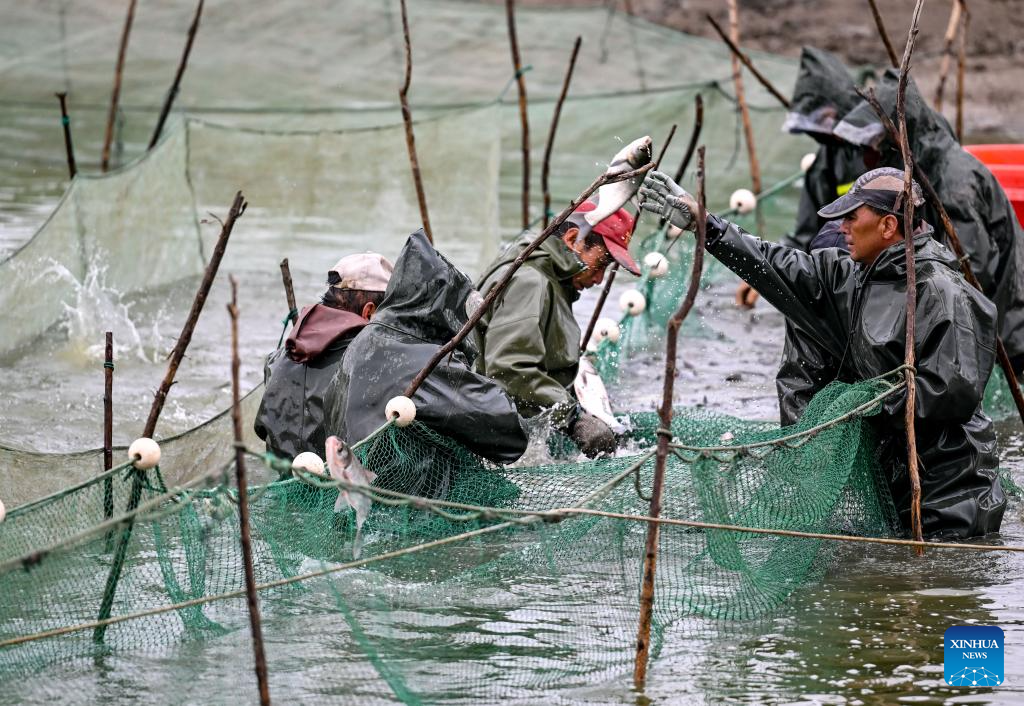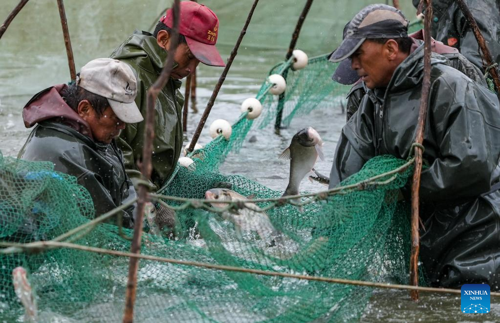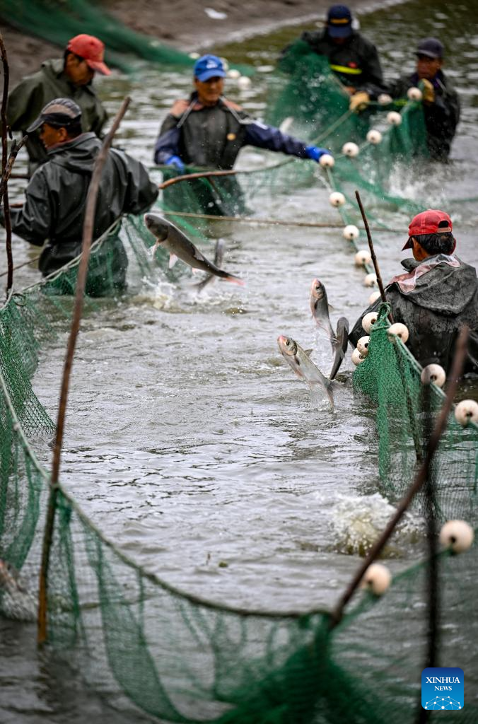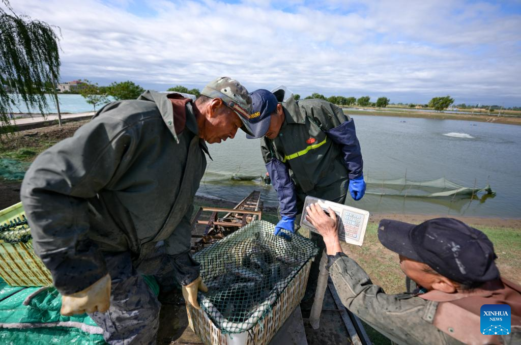 Staff catch fish at an aquaculture base in Helan County, Yinchuan, northwest China's Ningxia Hui Autonomous Region, Sept. 20, 2024. With abundant water resources from the Yellow River, Yinchuan has vigorously developed fisheries in recent years. (Xinhua/Yang Zhisen)