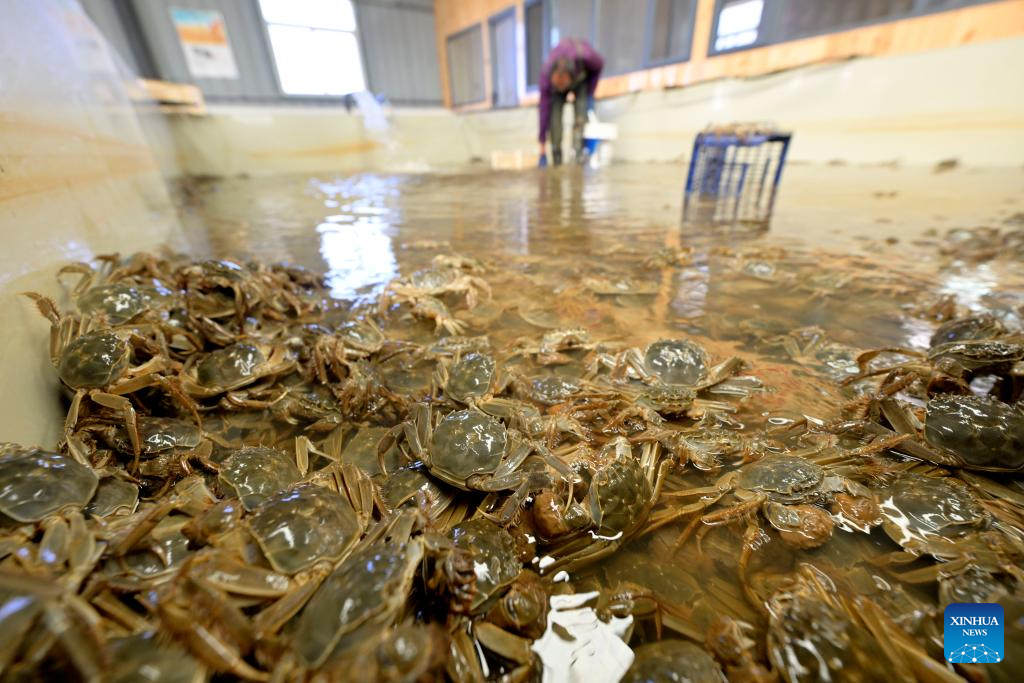 A staff member sorts out crabs at a distribution center of Helan County, Yinchuan, northwest China's Ningxia Hui Autonomous Region, Sept. 20, 2024. With abundant water resources from the Yellow River, Yinchuan has vigorously developed fisheries in recent years. (Xinhua/Wang Peng)