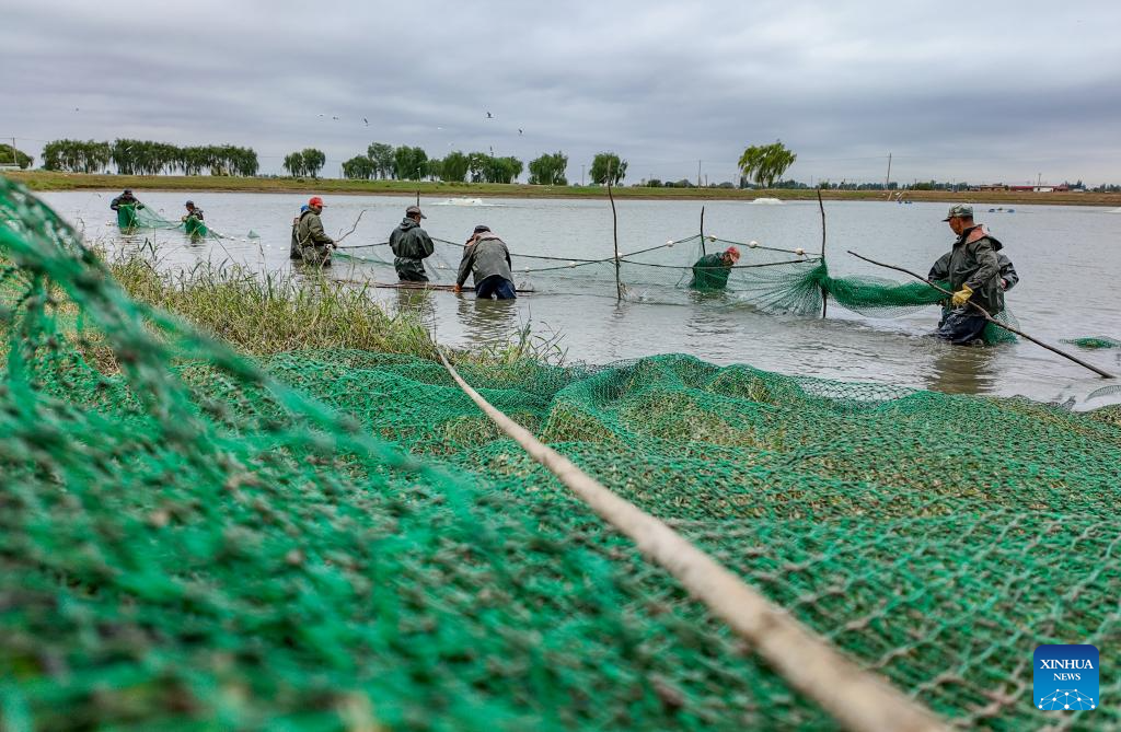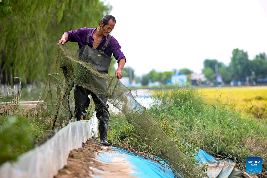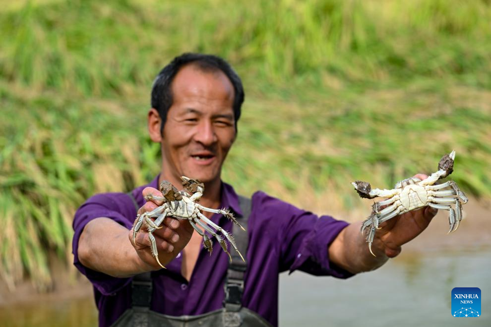 A staff member catches crabs at paddy fields of Helan County, Yinchuan, northwest China's Ningxia Hui Autonomous Region, Sept. 20, 2024. With abundant water resources from the Yellow River, Yinchuan has vigorously developed fisheries in recent years. (Xinhua/Feng Kaihua)