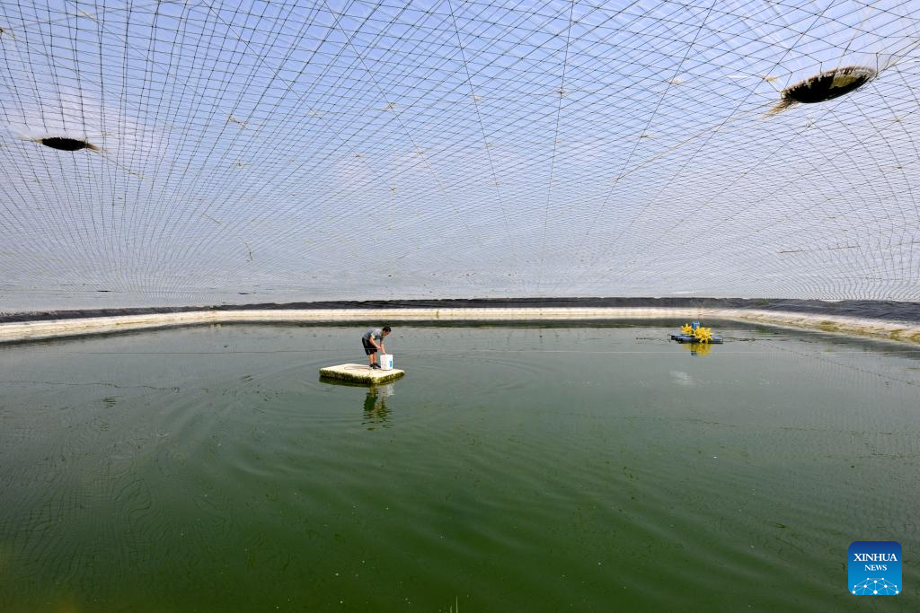 A staff member feeds prawns at a prawn cultivation base in Helan County, Yinchuan, northwest China's Ningxia Hui Autonomous Region, Sept. 19, 2024. With abundant water resources from the Yellow River, Yinchuan has vigorously developed fisheries in recent years. (Xinhua/Wang Peng)