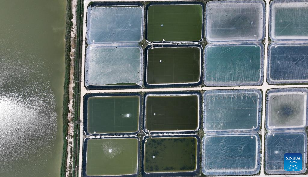 An aerial drone photo taken on Sept. 19, 2024 shows a prawn cultivation base in Helan County, Yinchuan, northwest China's Ningxia Hui Autonomous Region. With abundant water resources from the Yellow River, Yinchuan has vigorously developed fisheries in recent years. (Xinhua/Wang Peng)
