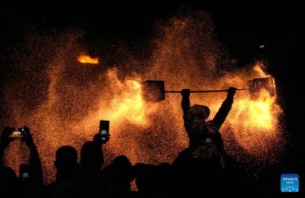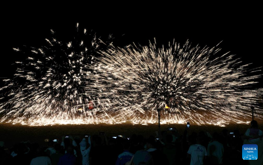 Folk artists throw molten iron to create fireworks in Haiyang, east China's Shandong Province, Sept. 21, 2024. The event aims to commemorate the seventh Chinese farmers' harvest festival which falls on Sept. 22 this year. (Xinhua/Xu Suhui)