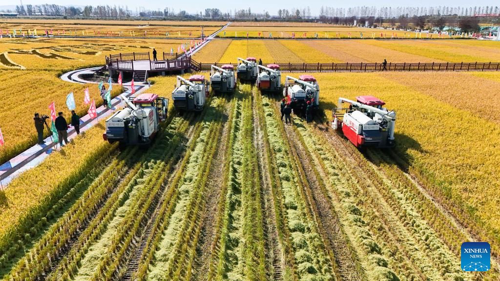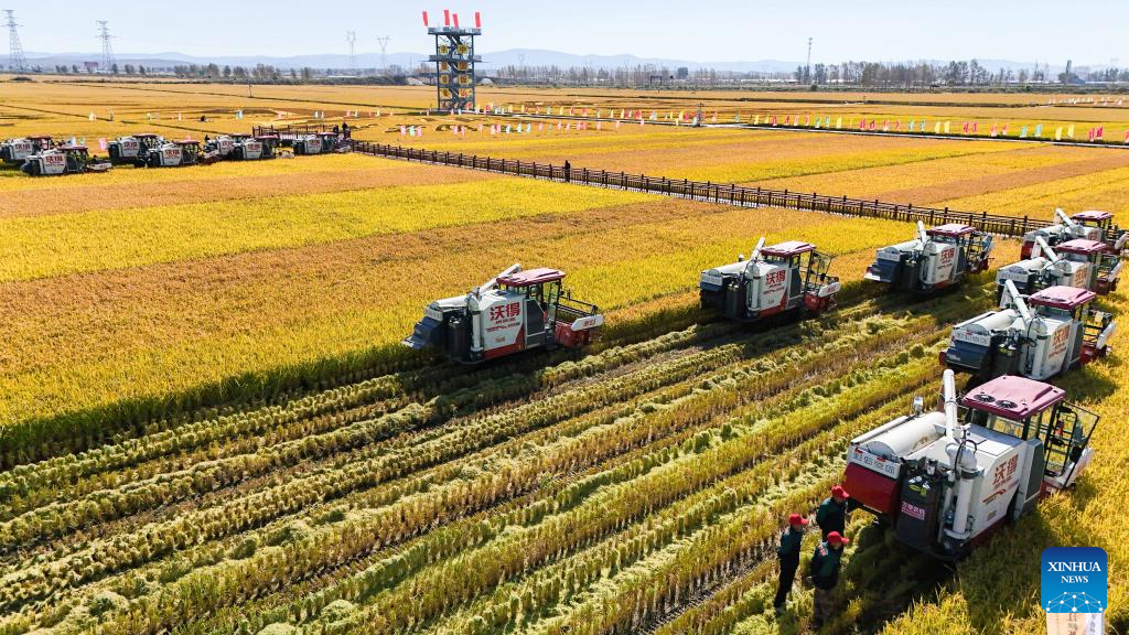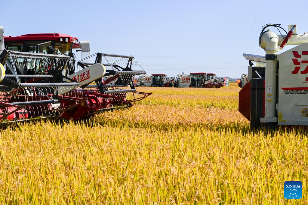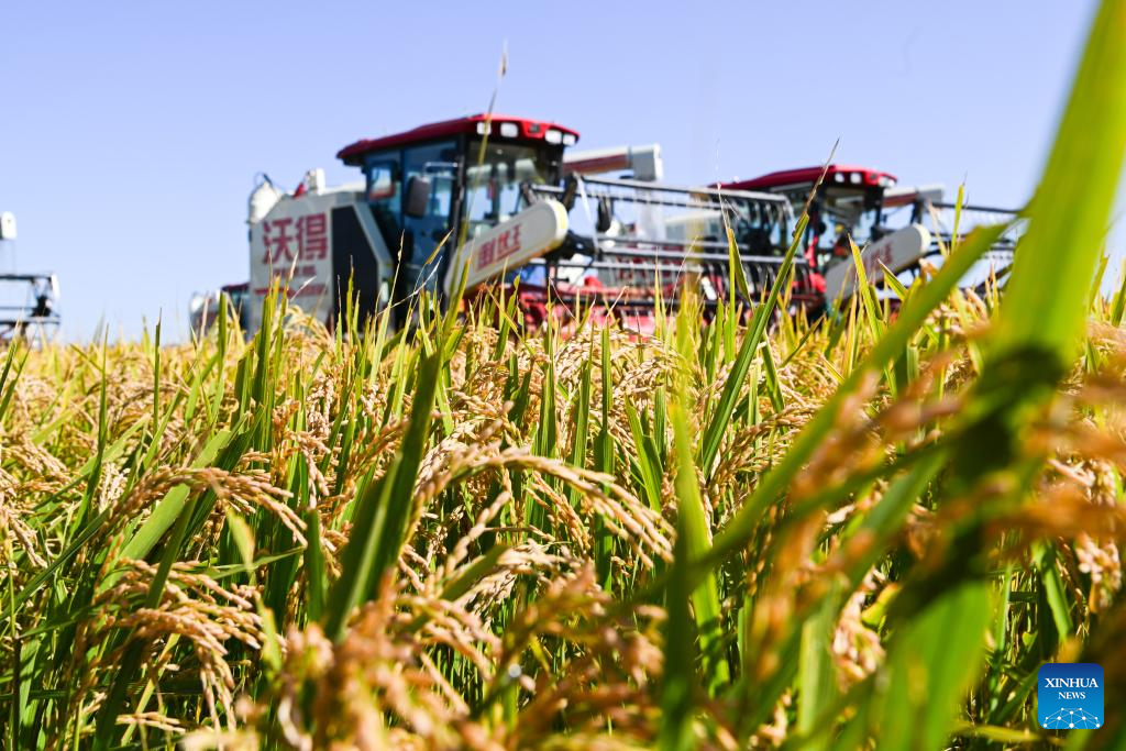 Harvesters are pictured in a paddy field in Fangzheng County of Harbin, northeast China's Heilongjiang Province, Sept. 22, 2024. (Xinhua/Wang Song)