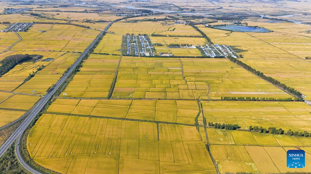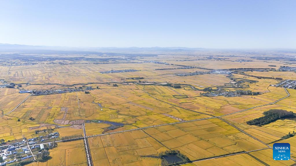 An aerial drone photo shows a paddy field in Fangzheng County of Harbin, northeast China's Heilongjiang Province, Sept. 22, 2024. (Xinhua/Wang Song)