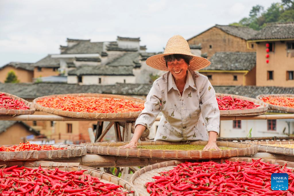 A villager airs crops at Yangchan Village in Huangshan City, east China's Anhui Province, Sept. 22, 2024. (Photo by Shi Yalei/Xinhua)