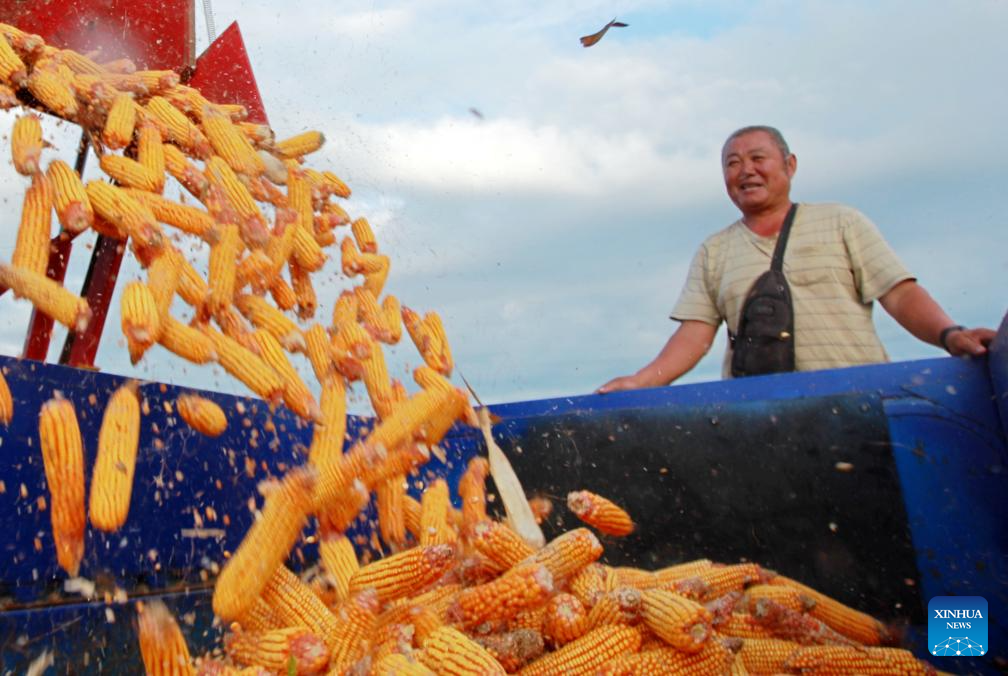 A farmer loads harvested corns onto a truck at Bianqiao Township of Linyi City, east China's Shandong Province, Sept. 17, 2024. (Photo by Wu Jiquan/Xinhua)
