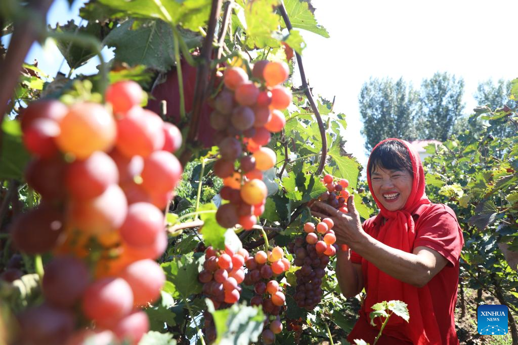 A farmer harvests grapes at an orchard of Xixiaoyi Village in Tangshan City, north China's Hebei Province, Sept. 22, 2024. (Photo by Zhu Dayong/Xinhua)