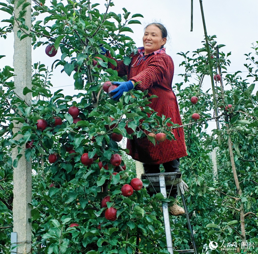 A villager picks apples in an orchard in Zhaojiayuan village, Cuijiatou township, Qianyang county, Baoji city, northwest China's Shaanxi Province, Sept. 19, 2024. (People's Daily Online/Bai Ge)