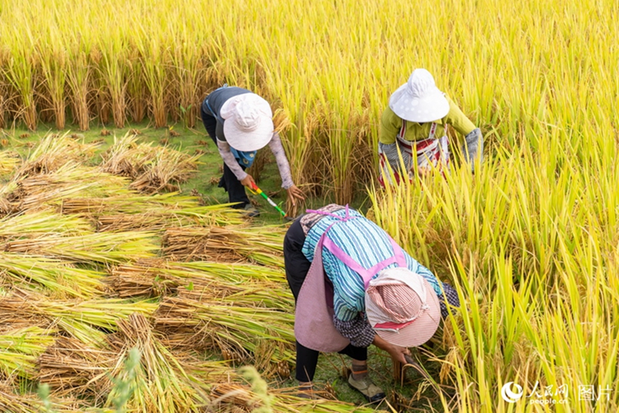 Villagers harvest rice in Gaopo township, Huaxi district, Guiyang city, southwest China's Guizhou Province, Sept. 12, 2024. (People's Daily Online/Tu Min)