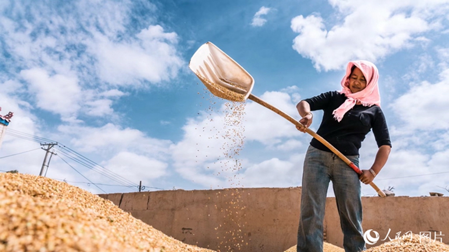 A villager dries grains in Dulan county, Haixi Mongolian and Tibetan Autonomous Prefecture, northwest China's Qinghai Province, Sept. 10, 2024. (People's Daily Online/Zhang Liping)