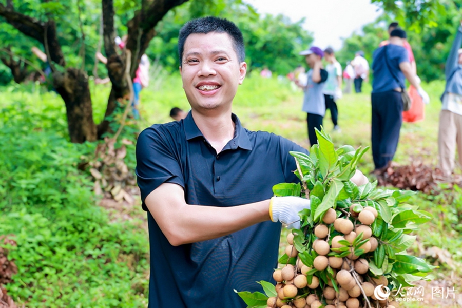 A man displays harvested longans in Wufeng village, Tong'an district, Xiamen city, southeast China's Fujian Province, Sept. 19, 2024. (People's Daily Online/Chen Bo)