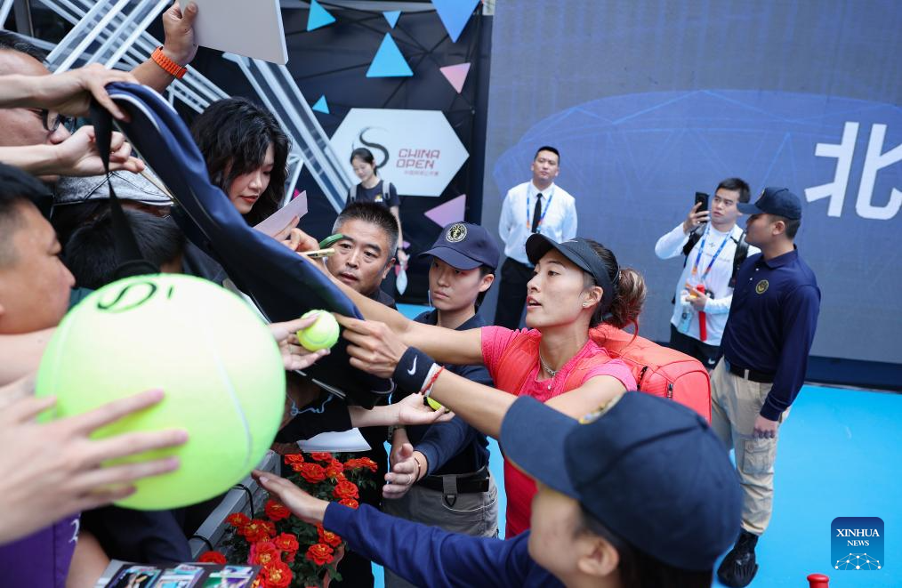 Zheng Qinwen of China signs autographs for supporters after a training session at 2024 China Open tennis tournament in Beijing, capital of China, Sept. 23, 2024. (Xinhua/Bai Xuefei)