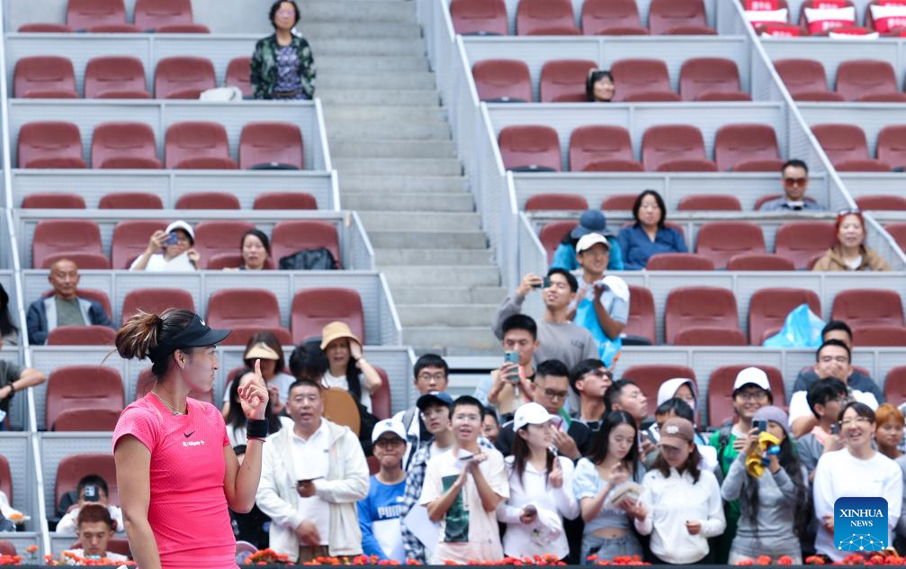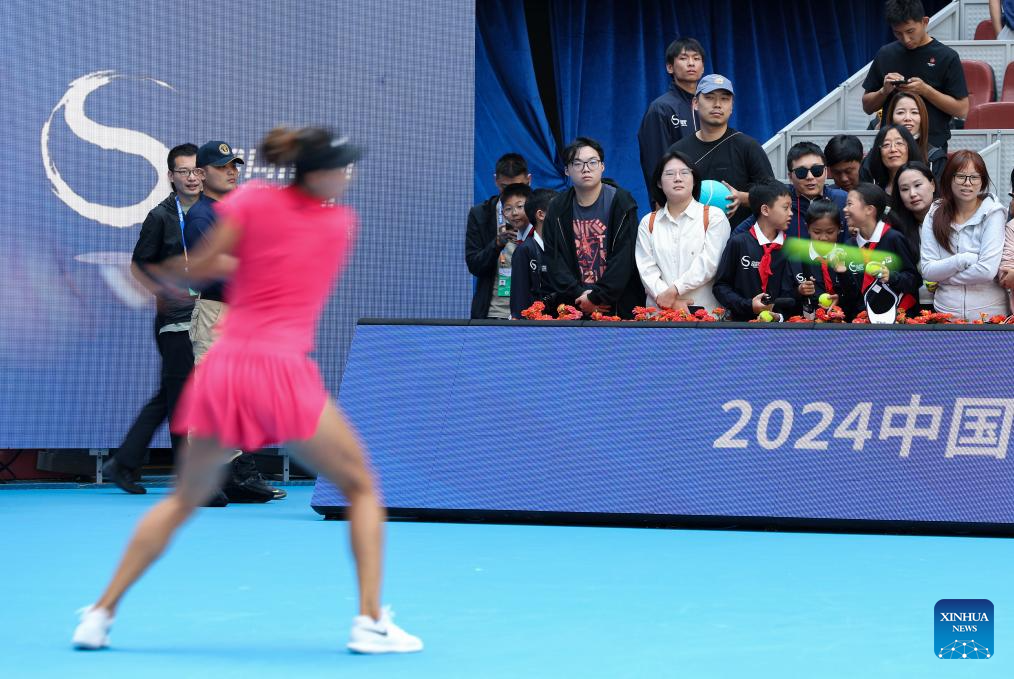 Spectators watch Zheng Qinwen (front) of China attending a training session at 2024 China Open tennis tournament in Beijing, capital of China, Sept. 23, 2024. (Xinhua/Bai Xuefei)