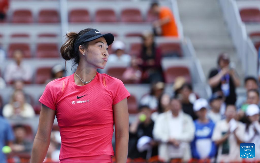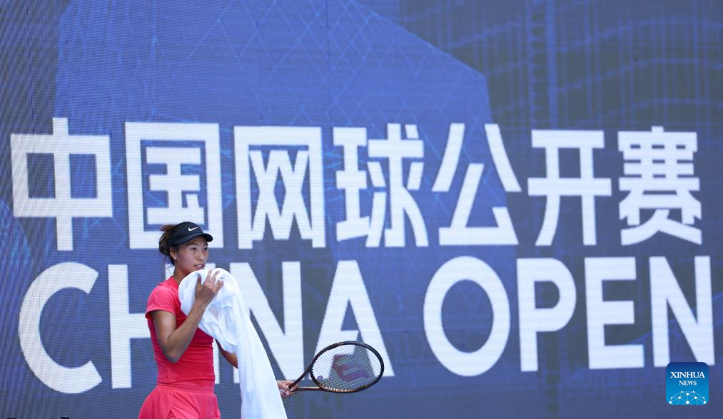 Zheng Qinwen of China attends a training session at 2024 China Open tennis tournament in Beijing, capital of China, Sept. 23, 2024. (Xinhua/Bai Xuefei)