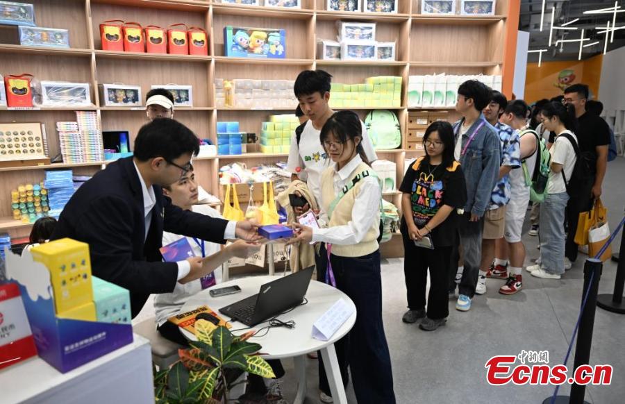 Volunteers for the Hangzhou Asian Games receive souvenirs during a special exhibition to mark the one-year anniversary of the Hangzhou Asian Games in Hangzhou, east China's Zhejiang Province, Sept. 23, 2024. (Photo: China News Service/Wang Gang)