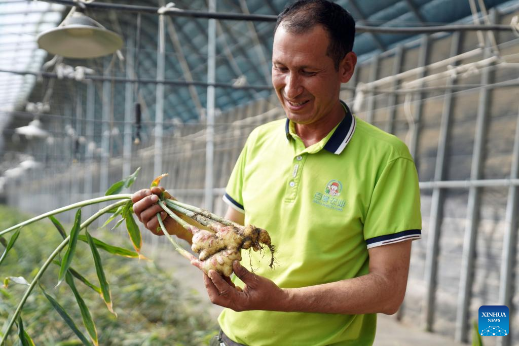 A worker shows newly harvested gingers at an agricultural industrial park, one of the "pairing assistance" programs of east China's Shandong province, in Yengisar County of Kashgar, northwest China's Xinjiang Uygur Autonomous Region, Sept. 22, 2024. (Xinhua/Zhao Yusi)