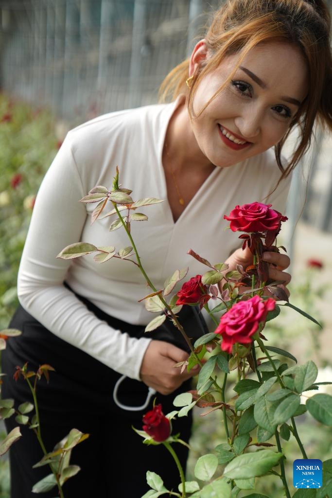 A worker shows roses planted at an agricultural industrial park, one of the "pairing assistance" programs of east China's Shandong province, in Yengisar County of Kashgar, northwest China's Xinjiang Uygur Autonomous Region, Sept. 22, 2024. (Xinhua/Zhao Yusi)