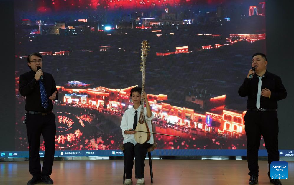 Residents rehearse their performance for the upcoming National Day celebrations at the citizen center of the Donghu residential community in Kashgar, northwest China's Xinjiang Uygur Autonomous Region, Sept. 22, 2024. (Xinhua/Zhao Yusi)