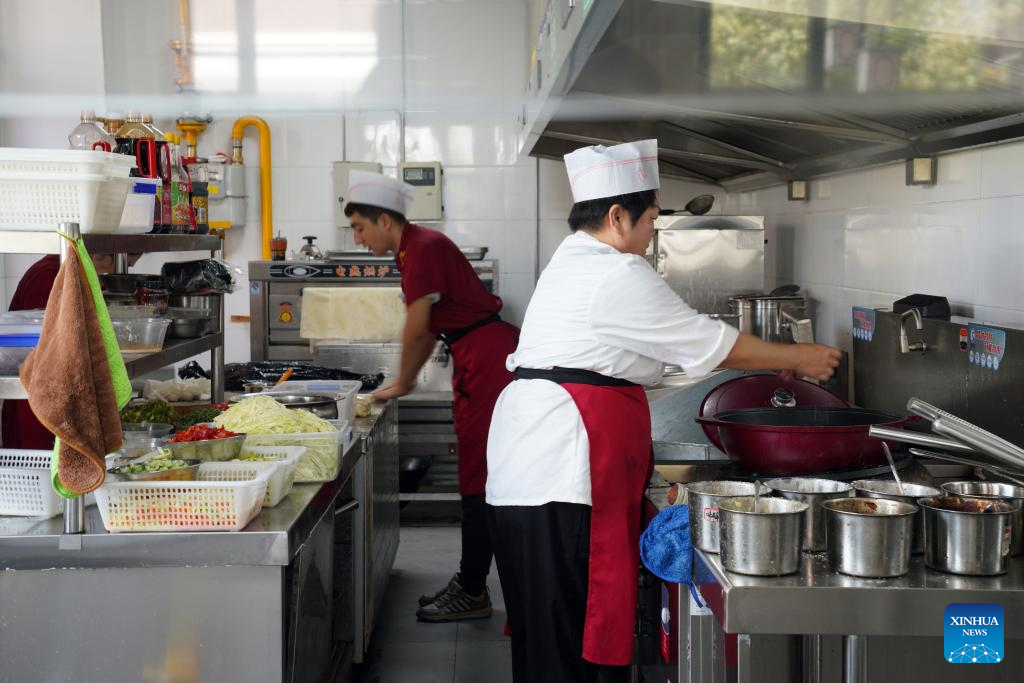 Workers prepare lunch at a canteen for the elderly at the Donghu residential community in Kashgar, northwest China's Xinjiang Uygur Autonomous Region, Sept. 22, 2024. (Xinhua/Zhao Yusi)?