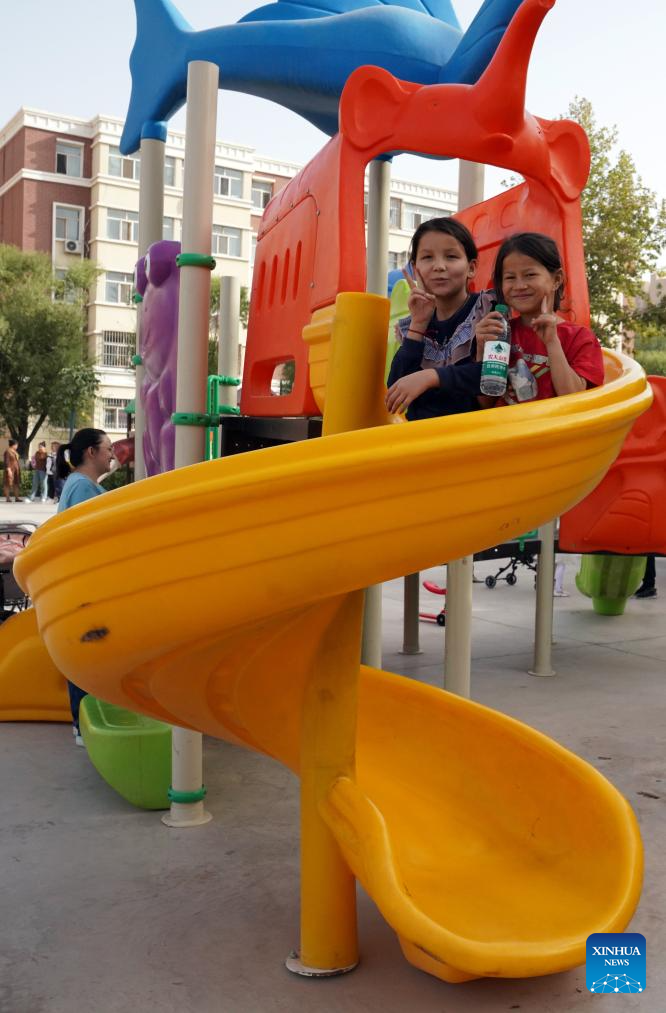 Children have fun at a playground of the Donghu residential community in Kashgar, northwest China's Xinjiang Uygur Autonomous Region, Sept. 22, 2024. (Xinhua/Zhao Yusi)