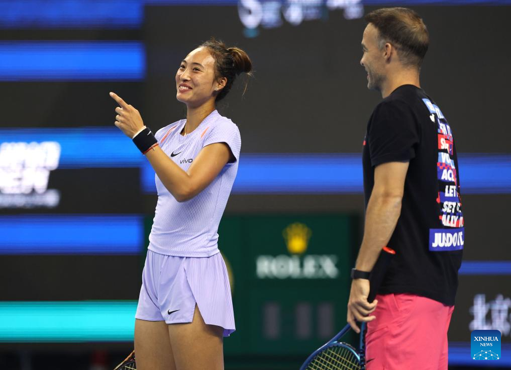 Zheng Qinwen (L) of China reacts during a training session at the 2024 China Open tennis tournament in Beijing, capital of China, Sept. 24, 2024. (Xinhua/Zhang Chen)