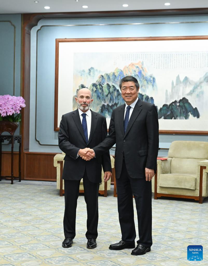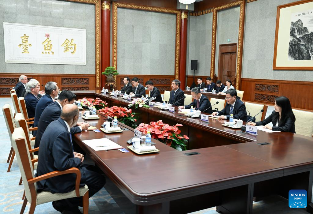 Chinese Vice Premier He Lifeng, also a member of the Political Bureau of the Communist Party of China (CPC) Central Committee, meets with Evan Greenberg, executive vice chair of the National Committee on U.S.-China Relations and the chairman of insurance company Chubb Limited, in Beijing, capital of China, Sept. 24, 2024. (Xinhua/Zhang Ling)