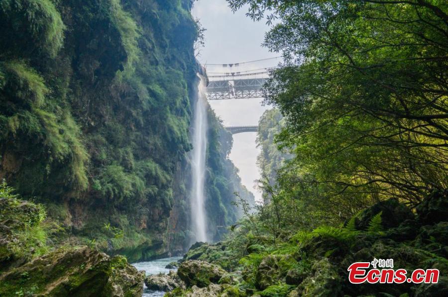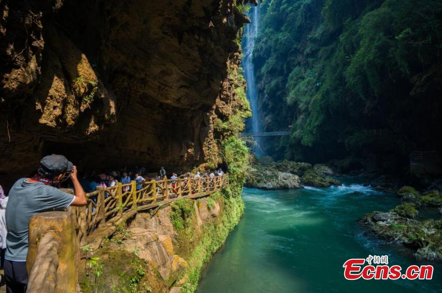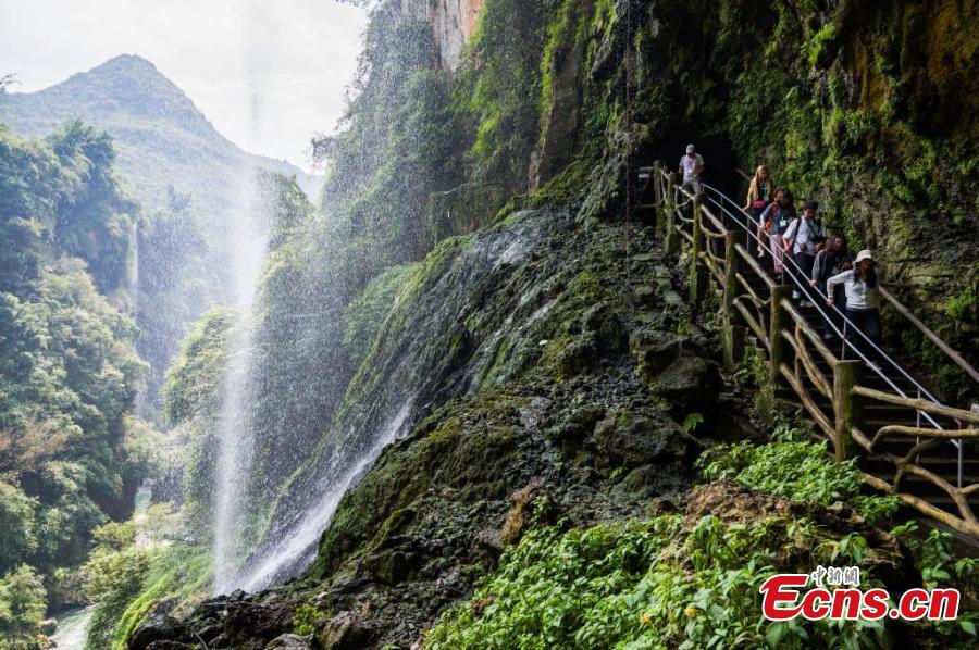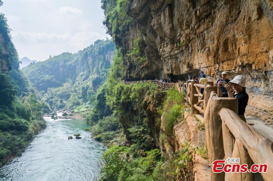 The canyon features waterfalls, deep caves, and shaped calcium sediments on both faces of its steep cliffs. The Xingyi UNESCO Global Geopark officially opened to the public on Tuesday.