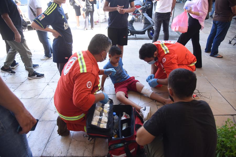 Medics apply medical treatment to an injured boy in Tripoli, Lebanon, on Sept. 25, 2024. (Photo by Khaled Habashiti/Xinhua)