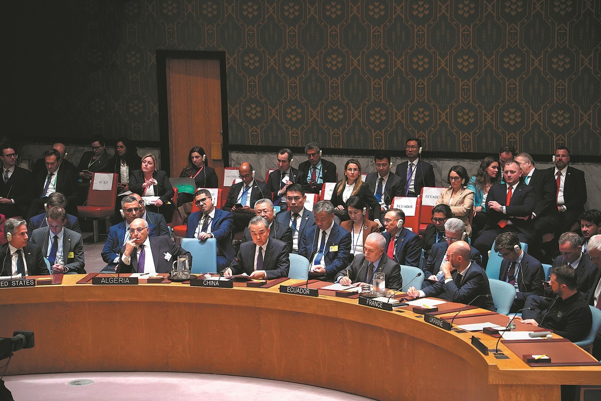 Foreign Minister Wang Yi attends a United Nations Security Council high-level meeting on the Ukraine crisis at the UN headquarters in New York on Tuesday. (MINLU ZHANG/CHINA DAILY)