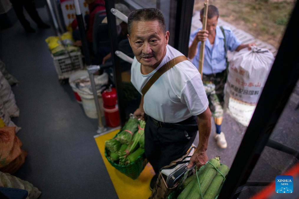 A farmer boards a dedicated bus with baskets of fresh vegetables in Wuhan, central China's Hubei Province, Sept. 3, 2024. (Xinhua/Wu Zhizun)