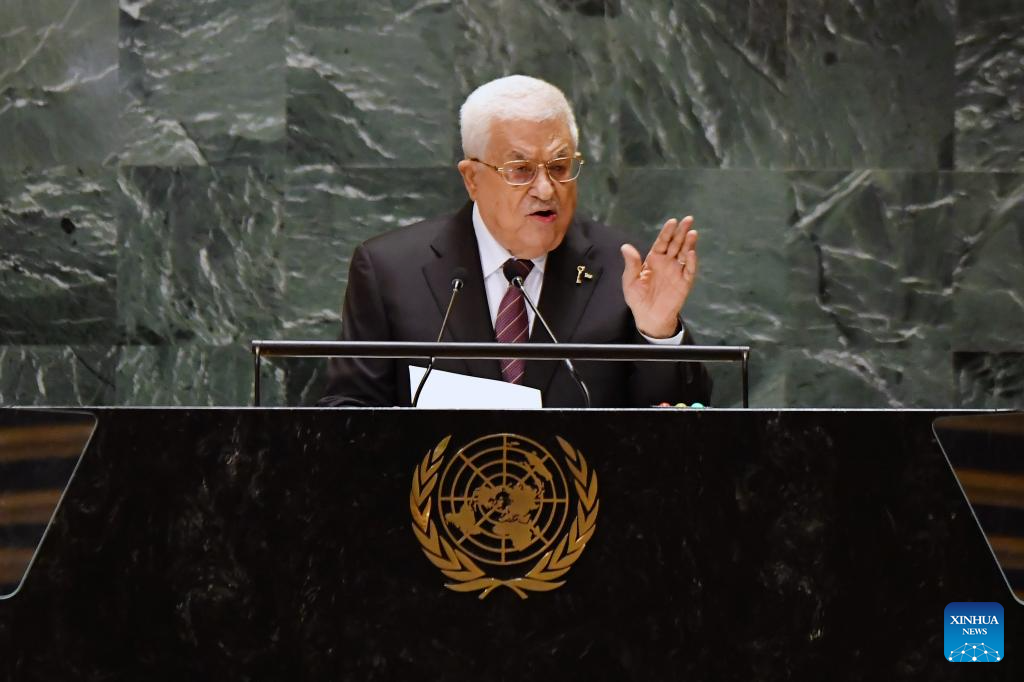 Palestinian President Mahmoud Abbas delivers a speech during the General Debate of the 79th session of the United Nations General Assembly (UNGA) at the UN headquarters in New York, on Sept. 26, 2024. Abbas received a long round of applause as he addressed the United Nations General Assembly (UNGA) on Thursday, insisting that "we will not leave, Palestine is our homeland," and "if anyone were to leave it would be the occupier." (Xinhua/Xie E)