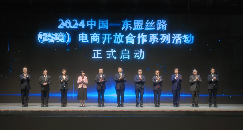 Liu Ning, secretary of the Guangxi Zhuang Autonomous Regional Committee of the Communist Party of China, and other officials and guests attend the 2024 China-ASEAN Silk Road (Cross-border) E-commerce Open Cooperation Promotion Event at the AI exhibition and performance center, jointly developed by People's Daily Online and the Guangxi Tourism Development Group, in Nanning, capital of south China's Guangxi Zhuang Autonomous Region. (Photo courtesy of the organizer of the event)
