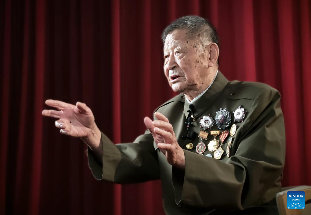 Huang Zongde tells his story during the wars in an interview on Sept. 10, 2024. (Photo by Jin Xianbin/Xinhua)
