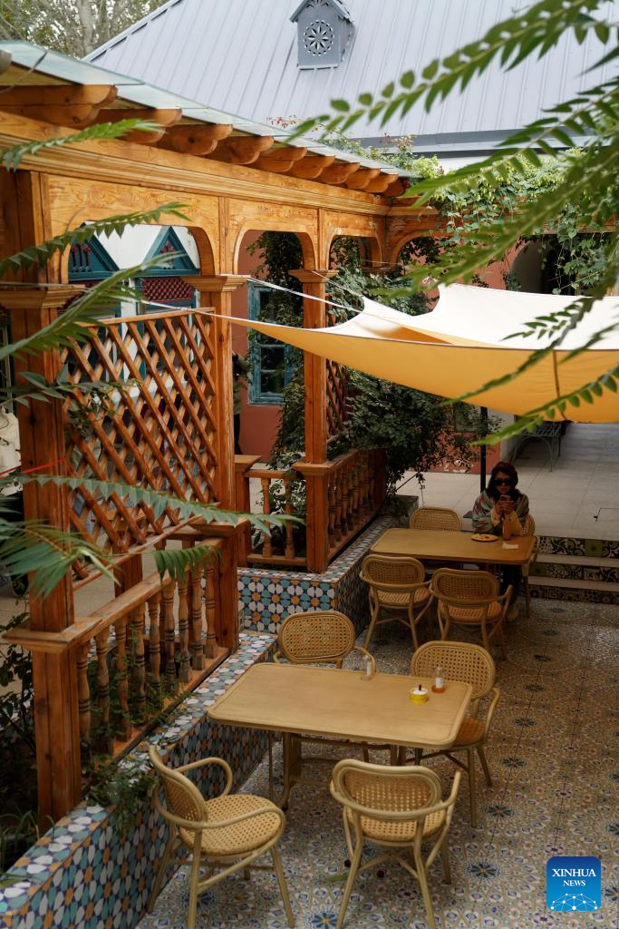 A tourist is seen at a restaurant on the Liuxing Street in Yining City, Ili Kazak Autonomous Prefecture, northwest China's Xinjiang Uygur Autonomous Region, Sept. 27, 2024. (Xinhua/Zhao Yusi)