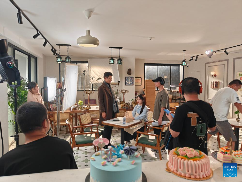 This undated photo shows the filming site of a micro drama at the Shanghai International Short Video Center in Shanghai, east China. (Xinhua)