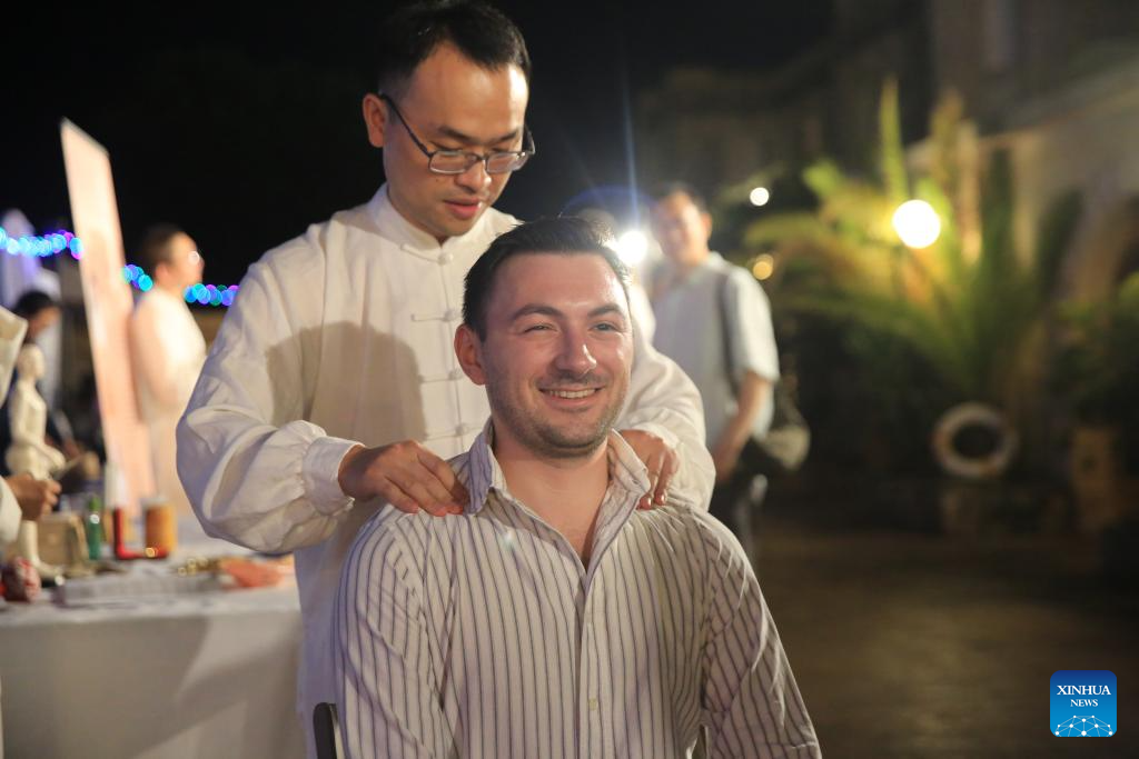 Pembroke Mayor Kaylon Zammit (front) experiences Chinese-style massage treatment in Pembroke, Malta, Sept. 27, 2024. (Xinhua/Chen Wenxian)