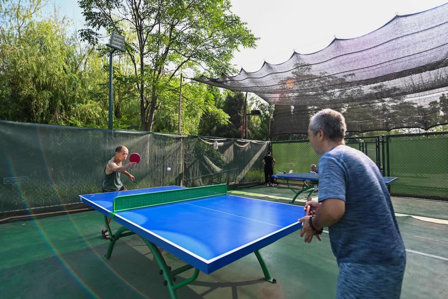 People play table tennis at a city park in north China's Tianjin Municipality, Aug. 8, 2024. (Xinhua/Sun Fanyue)