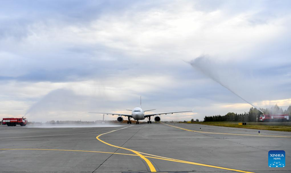 The first direct flight from China's Shanghai to Kazan passes a welcome water gate upon landing at the airport of Kazan in Kazan, Russia, Sept. 28, 2024. (Xinhua/Cao Yang)