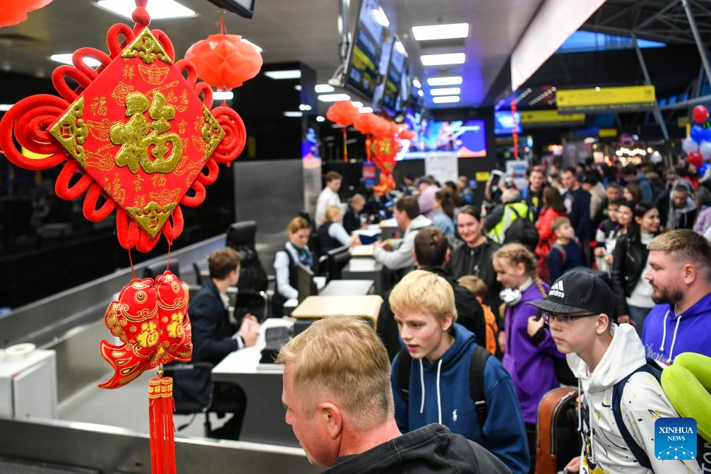 Passengers aboard the first direct flight from China's Shanghai to Kazan operated by China Eastern Airlines, arrive at the airport of Kazan in Kazan, Russia, Sept. 28, 2024. (Xinhua/Cao Yang)