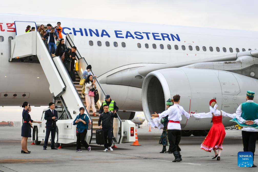 The first direct flight from China's Shanghai to Kazan operated by China Eastern Airlines arrives at the airport of Kazan in Kazan, Russia, Sept. 28, 2024. (Xinhua/Cao Yang)