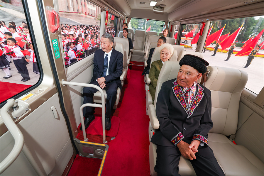 Recipients of national honorary titles arrive at the Great Hall of the People as part of a motorcade on Sunday. (Photo/Xinhua)