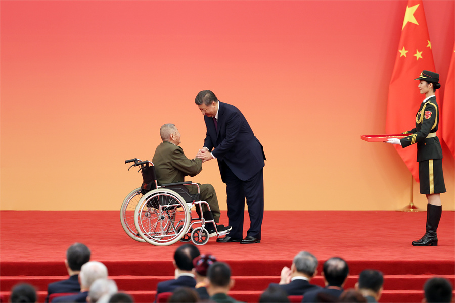 President Xi presents Huang Zongde, a war hero, with the Medal of the Republic, which honors people who have made exceptional contributions to the development of the PRC. (WANG ZHUANGFEI/CHINA DAILY)