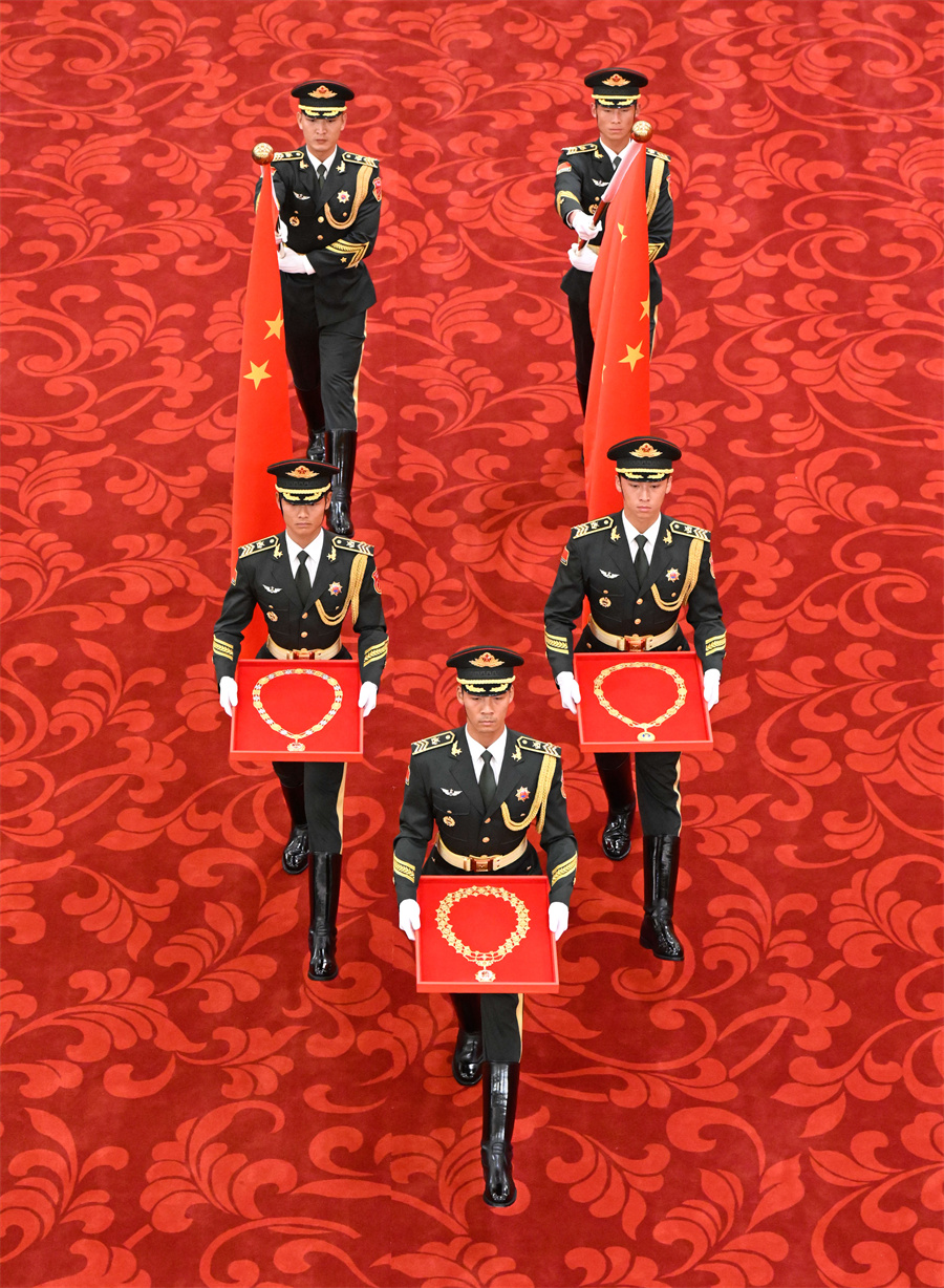 Guards of honor escort honorary medals to the venue of the presentation ceremony on Sunday. During the ceremony in Beijing, 15 individuals were awarded China's national medals and national honorary titles. (Photo/Xinhua)